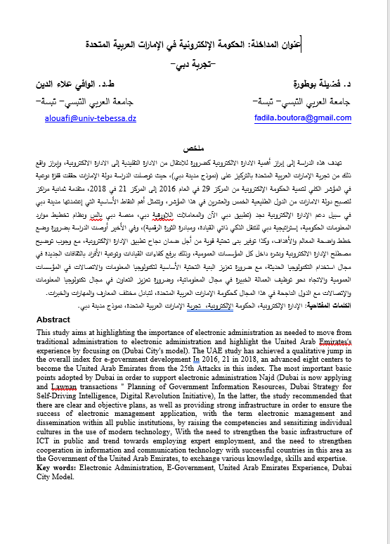 تهدف هذه الدراسة إلى إبراز أهمية الادارة الالكترونية كضرورة للانتقال من الادارة التقليدية إلى الادارة الالكترونية، وإبراز واقع ذلك من تجربة الإمارات العربية المتحدة بالتركيز على (نموذج مدينة دبي)، حيث توصلت الدراسة دولة الإمارات حققت قفزة نوعية في المؤشر الكلي لتنمية الحكومة الإلكترونية من المركز 29 في العام 2016 إلى المركز 21 في 2018، متقدمة ثمانية مراكز لتصبح دولة الامارات من الدول الطليعية الخمس والعشرين في هذا المؤشر، وتتمثل أهم النقاط الأساسية التي إعتمدتها مدينة دبي في سبيل دعم الإدارة الإلكترونية نجد (تطبيق دبي الآن والمعاملات اللاورقية دبي، منصة دبي بالس ونظام تخطيط موارد المعلومات الحكومية، إستراتيجية دبي للتنقل الذكي ذاتي القيادة، ومبادرة الثورة الرقمية)، وفي الأخير أوصت الدراسة بضرورة وضع خطط واضحة المعالم والأهداف، وكذا توفير بنى تحتية قوية من أجل ضمان نجاح تطبيق الإدارة الإلكترونية، مع وجوب توضيح مصطلح الإدارة الالكترونية ونشره داخل كل المؤسسات العمومية، وذلك برفع كفاءات القيادات وتوعية الأفراد بالثقافات الجديدة في مجال استخدام التكنولوجيا الحديثة، مع ضرورة تعزيز البنية التحتية الأساسية لتكنولوجيا المعلومات والاتصالات في المؤسسات العمومية والاتجاه نحو توظيف العمالة الخبيرة في مجال المعلوماتية، وضرورة تعزيز التعاون في مجال تكنولوجيا المعلومات والإتصالات مع الدول الناجحة في هذا المجال كحكومة الإمارات العربية المتحدة، لتبادل مختلف المعارف والمهارات والخبرات.
