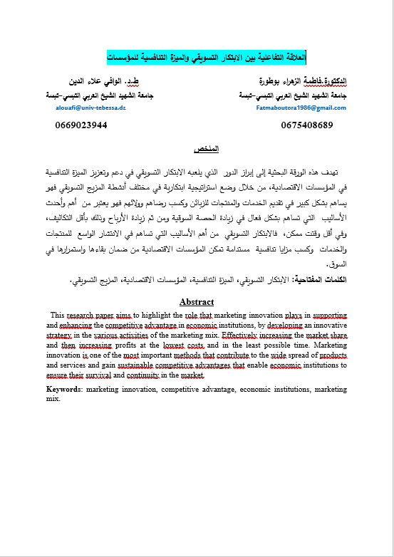 الملخص تهدف هذه الورقة البحثية إلى إبراز الدور الذي يلعبه الابتكار التسويقي في دعم وتعزيز الميزة التنافسية في المؤسسات الاقتصادية، من خلال وضع استراتيجية ابتكارية في مختلف أنشطة المزيج التسويقي فهو يساهم بشكل كبير في تقديم الخدمات والمنتجات للزبائن وكسب رضاهم وولائهم فهو يعتبر من أهم وأحدث الأساليب التي تساهم بشكل فعال في زيادة الحصة السوقية ومن ثم زيادة الأرباح وذلك بأقل التكاليف، وفي أقل وقتت ممكن، فالابتكار التسويقي من أهم الأساليب التي تساهم في الانتشار الواسع للمنتجات والخدمات وكسب مزايا تنافسية مستدامة تمكن المؤسسات الاقتصادية من ضمان بقاءها واستمرارها في السوق.