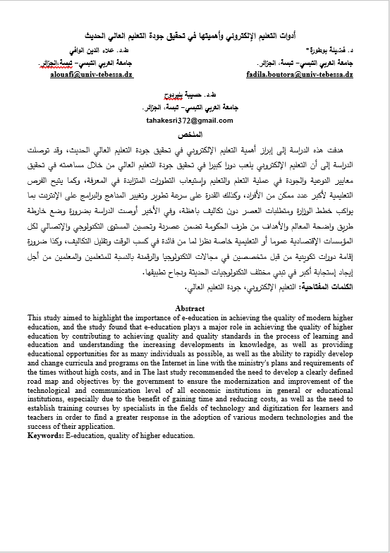 | dc.description.abstract | الملخص هدفت هذه الدراسة إلى إبراز أهمية التعليم الإلكتروني في تحقيق جودة التعليم العالي الحديث، وقد توصلت الدراسة إلى أن التعليم الإلكتروني يلعب دورا كبيرا في تحقيق جودة التعليم العالي من خلال مساهمته في تحقيق معايير النوعية والجودة في عملية التعلم والتعليم وإستيعاب التطورات المتزايدة في المعرفة، وكما يتيح الفرص التعليمية لأكبر عدد ممكن من الأفراد، وكذلك القدرة على سرعة تطوير وتغيير المناهج والبرامج على الإنترنت بما يواكب خطط الوزارة ومتطلبات العصر دون تكاليف باهظة، وفي الأخير أوصت الدراسة بضرورة وضع خارطة طريق واضحة المعالم والأهداف من طرف الحكومة تضمن عصرنة وتحسين المستوى التكنولوجي والإتصالي لكل المؤسسات الإقتصادية عموما أو التعليمية خاصة نظرا لما من فائدة في كسب الوقت وتقليل التكاليف، وكذا ضرورة إقامة دورات تكوينية من قبل متخصصين في مجالات التكنولوجيا والرقمنة بالنسبة للمتعلمين والمعلمين من أجل إيجاد إستجابة أكبر في تبني مختلف التكنولوجيات الحديثة ونجاح تطبيقها. | |