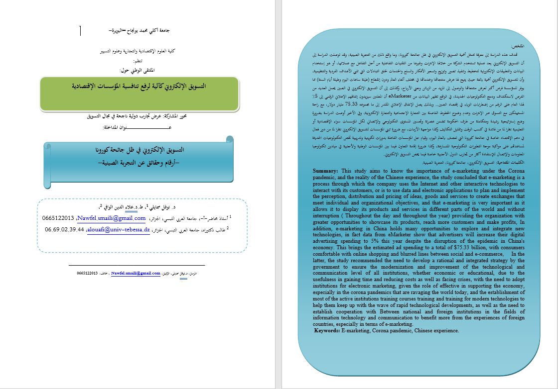 تهدف هذه الدراسة إلى معرفة تتمثل أهمية التسويق الإلكتروني في ظل جائحة كورونا، وما واقع ذلك من التجربة الصينية، وقد توصلت الدراسة إلى أن التسويق الإلكتروني يعد عملية تستخدم الشركة من خلالها الإنترنت وغيرها من التقنيات التفاعلية من أجل التفاعل مع عملائها، أو هو إستخدام البيانات والتطبيقات الإلكترونية لتخطيط وتنفيذ تصور وتوزيع وتسعير الأفكار والسلع والخدمات لخلق التبادلات التي تلبي الأهداف الفردية والتنظيمية، وأن للتسويق الإلكتروني أهمية بالغة حيث يتيح لها عرض منتجاتها وخدماتها في مختلف أنحاء العالم ودون إنقطاع (طيلة ساعات اليوم وطيلة أيام السنة) مما يوفر للمؤسسة فرص أكبر لعرض منتجاتها والوصول إلى المزيد من الزبائن وجني الأرباح، وكذلك إلى أن التسويق الإلكتروني في الصين يحمل العديد من الفرص لاستكشاف ودمج التكنولوجيات الجديدة، في الواقع تظهر البيانات من eMarketer أن المعلنين سيزيدون إنفاقهم الإعلاني الرقمي إلى 5٪ لهذا العام على الرغم من إضطرابات الوباء في إقتصاد الصين.. وبذلك يصل الإنفاق الإعلاني المقدر إلى ما مجموعه 75.33 مليار دولار، مع راحة المستهلكين مع التسوق عبر الإنترنت وعدم وضوح الخطوط الفاصلة بين التجارة الإجتماعية والتجارة الإلكترونية، وفي الأخير أوصت الدراسة بضرورة وضع إستراتيجية رشيدة ومتكاملة من طرف الحكومة تضمن عصرنة وتحسين المستوى التكنولوجي والإتصالي لكل المؤسسات سواء الإقتصادية أو التعليمية نظرا لما من فائدة في كسب الوقت وتقليل التكاليف وكذا مواجهة الأزمات، مع ضرورة تبني المؤسسات للتسويق الإلكتروني نظرا لما من دور فعال في دعم الإقتصاد خاصة في جائحة كورونا التي تعصف بالعالم اليوم، وقيام جل المؤسسات الفاعلة بدورات تكوينية وتدريبية تخص التكنولوجيات الحديثة لمساعدتهم على مواكبة موجة التطورات التكنولوجية المتسارعة، وكذا ضرورة إقامة التعاون فيما بين المؤسسات الوطنية والأجنبية في ميادين تكنولوجيا المعلومات والإتصال للإستفادة أكثر من تجارب الدول الأجنبية خاصة فيما يخص التسويق الإلكتروني.