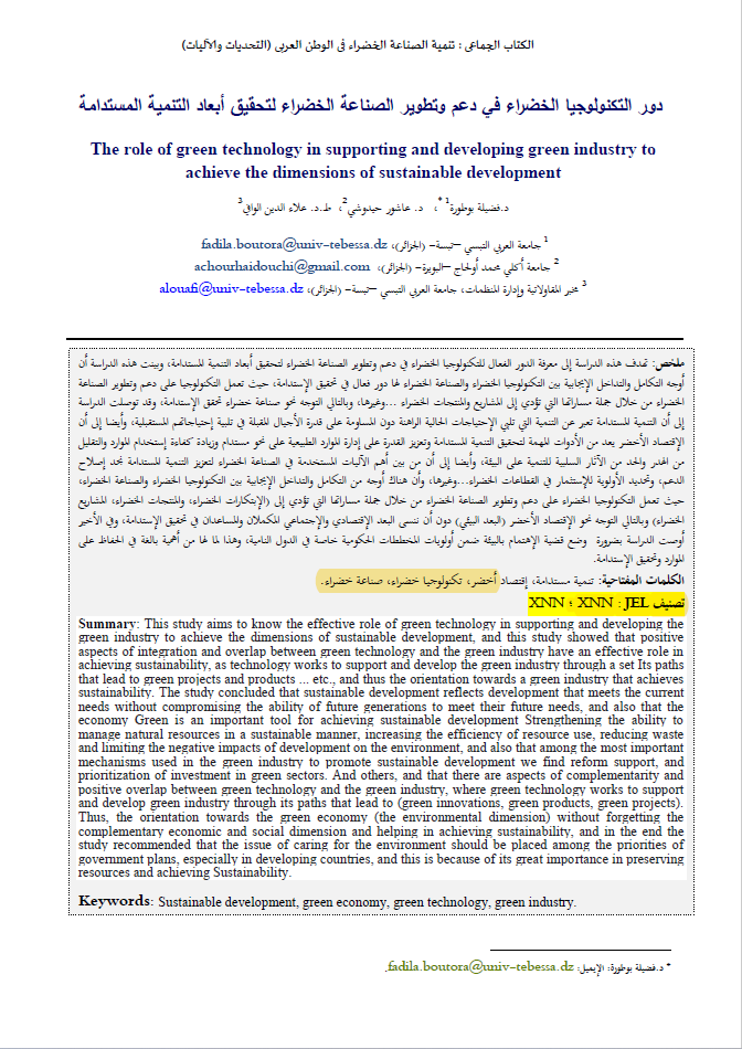 ملخص: تهدف هذه الدراسة إلى معرفة الدور الفعال للتكنولوجيا الخضراء في دعم وتطوير الصناعة الخضراء لتحقيق أبعاد التنمية المستدامة، وبينت هذه الدراسة أن أوجه التكامل والتداخل الإيجابية بين التكنولوجيا الخضراء والصناعة الخضراء لها دور فعال في تحقيق الإستدامة، حيث تعمل التكنولوجيا على دعم وتطوير الصناعة الخضراء من خلال جملة مساراتها التي تؤدي إلى المشاريع والمنتجات الخضراء ...وغيرها، وبالتالي التوجه نحو صناعة خضراء تحقق الإستدامة، وقد توصلت الدراسة إلى أن التنمية المستدامة تعبر عن التنمية التي تلبي الإحتياجات الحالية الراهنة دون المساومة على قدرة الأجيال المقبلة في تلبية إحتياجاتهم المستقبلية، وأيضا إلى أن الإقتصاد الأخضر يعد من الأدوات المهمة لتحقيق التنمية المستدامة وتعزيز القدرة على إدارة الموارد الطبيعية على نحو مستدام وزيادة كفاءة إستخدام الموارد والتقليل من الهدر والحد من الآثار السلبية للتنمية على البيئة، وأيضا إلى أن من بين أهم الآليات المستخدمة في الصناعة الخضراء لتعزيز التنمية المستدامة نجد إصلاح الدعم، وتحديد الأولوية للإستثمار في القطاعات الخضراء...وغيرها، وأن هناك أوجه من التكامل والتداخل الإيجابية بين التكنولوجيا الخضراء والصناعة الخضراء، حيث تعمل التكنولوجيا الخضراء على دعم وتطوير الصناعة الخضراء من خلال جملة مساراتها التي تؤدي إلى (الإبتكارات الخضراء، والمنتجات الخضراء، المشاريع الخضراء) وبالتالي التوجه نحو الإقتصاد الأخضر (البعد البيئي) دون أن ننسى البعد الإقتصادي والإجتماعي المكملان والمساعدان في تحقيق الإستدامة، وفي الأخير أوصت الدراسة بضرورة وضع قضية الإهتمام بالبيئة ضمن أولويات المخططات الحكومية خاصة في الدول النامية، وهذا لما لها من أهمية بالغة في الحفاظ على الموارد وتحقيق الإستدامة.